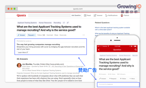 如上圖,廣告在疑問下方,還被標(biāo)注上“某某推廣”的字樣。PC端的用戶會看到一小段推薦文字,在移動端中,就只有廣告商的姓名。 在正式引入廣告效勞之前,Quora 也進行了一系列的變現(xiàn)嘗試,包含 AMA(Ask Me Anything,咨詢我任何疑問)、付費打賞等。 關(guān)于許多創(chuàng)業(yè)公司來說,商業(yè)變現(xiàn)是一件很急切的事。只需流量滿意,大有些公司會挑選廣告投進作為盈余點。可是也有相當(dāng)有些的公司,不太思考投進的廣告關(guān)于投進商和用戶是不是都有價值。Quora 對廣告投進的慎重情緒讓咱們看到,不論公司開展到啥期間,都不要影響給用戶帶來的價值。 (三)添加期Quora 一向是一家十分低調(diào)的公司,他們很少對外發(fā)布數(shù)據(jù),創(chuàng)始人也一向著重內(nèi)容的質(zhì)量和用戶體會才是他們真實關(guān)懷的工作。可是活潑用戶數(shù)量最少能闡明Quora 的受歡迎程度,2016年3月他們宣告有1 億月活,到D輪就添加到1.9 億月活,時刻相差僅僅1年。這中心他們究竟做了啥? 2014 年 完結(jié) C 輪融資時,他們依然說這些錢的主要用途還是在商品優(yōu)化上。創(chuàng)始人的思路是先添加網(wǎng)站上的內(nèi)容,讓內(nèi)容與用戶數(shù)量相平衡,變現(xiàn)疑問就會方便的解決。 迭代過程中他們上線了許多新的功用,定時約請名人的微訪談 Writing Sessions,讓用戶能夠賞格發(fā)問的 Knowledge Prizes,以及約請了奧巴馬的名人認證等等。這些功用的中心意圖依然是進步內(nèi)容質(zhì)量,共享和促進常識添加。