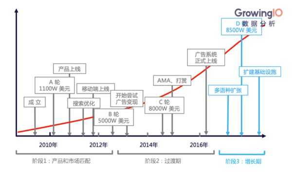 Sean Ellis,在2010年最早提出Growth Hacker的概念,他先后效勞于多家硅谷創(chuàng)業(yè)公司并協(xié)助 Dropbox 完結(jié)了年500%的添加。Sean Ellis 以為一家成功的創(chuàng)業(yè)公司必定先后閱歷三個期間:Product / Market Fit(商品和商場匹配期)、Transition to Growth(過渡期)、Growth(添加期)。 SocialCam 失利的地方就在于前期商品還沒有和商場匹配就開端大規(guī)模擴大之路,就像房子地基沒做好就開端蓋樓,失利是必定的。 回到咱們今天的主角 Quora ,它前期的添加速度遠遠沒有 SocialCam 那么冷艷,可是一向穩(wěn)定添加。那么八年來,Quora 是如何一步一步走過來的呢? 二、Quora 的添加黑客之旅 正如上面的創(chuàng)業(yè)金字塔模型,Quora 的添加進程能夠分為明顯的三個期間。 (一)商品和商場匹配期Quora 在融資方面的表現(xiàn)十分奇特,商品上線前 3個月就取得了 1100 萬美元的 A 輪融資,估值 8600萬美元。這不只得益于創(chuàng)始人自身的明星效應(yīng)(他是 Facebook 的首任CTO),更是由于 Quora 對商場的定位十分精確,他們的中心價值點即是高質(zhì)量的內(nèi)容。