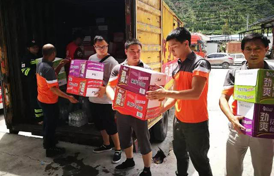 申通快遞員為九寨溝哀鴻免費發放應急救災物資。