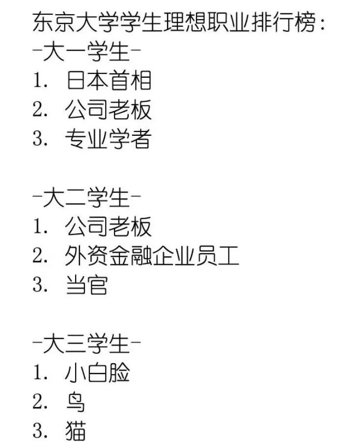 昨日推特上這張圖火了 東京大學學生抱負工作排行榜 不同年級的同學差別很大呢