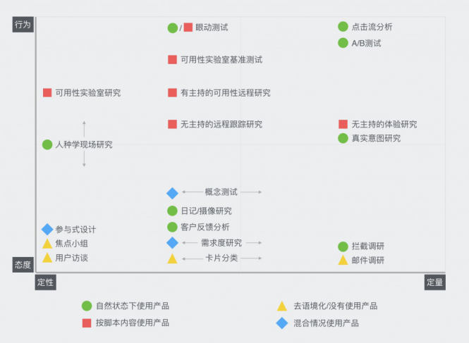 其實用戶體會研討辦法有許多,這兒給咱們說四點,便是咱們能夠從四個維度——情緒VS行為、定性VS定量、運用場景以及產品開發所在的階段來進行考慮。 下圖是最常用的20種用戶研討辦法的散布: