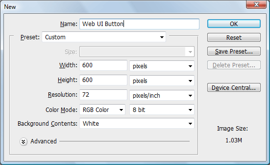 第1步:創立Photoshop文檔 該按鈕大小(寬x長)170像素x50像素。我們的畫布大一點,比如設為600像素x600像素