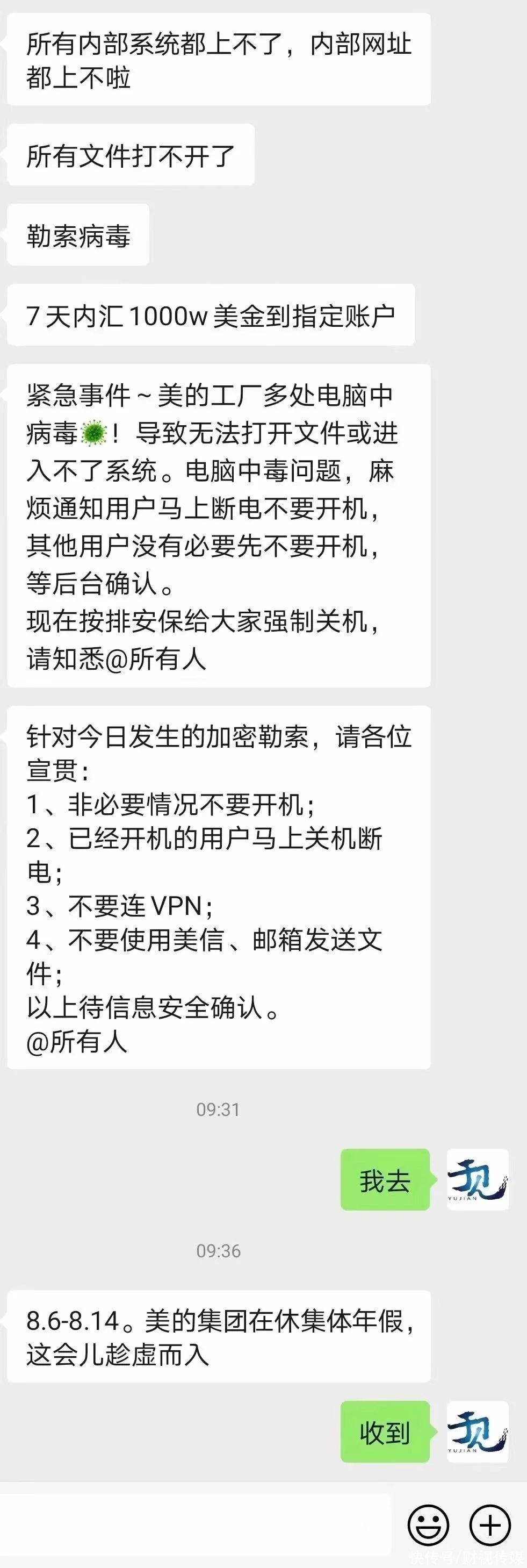 8月11日晚間,微博@美的集團針對“公司內網遭受電腦病毒侵略,被勒索1000萬美金”風聞發布闡明。美的表示,8月11日,美的集團遭受新型網絡病毒進犯,